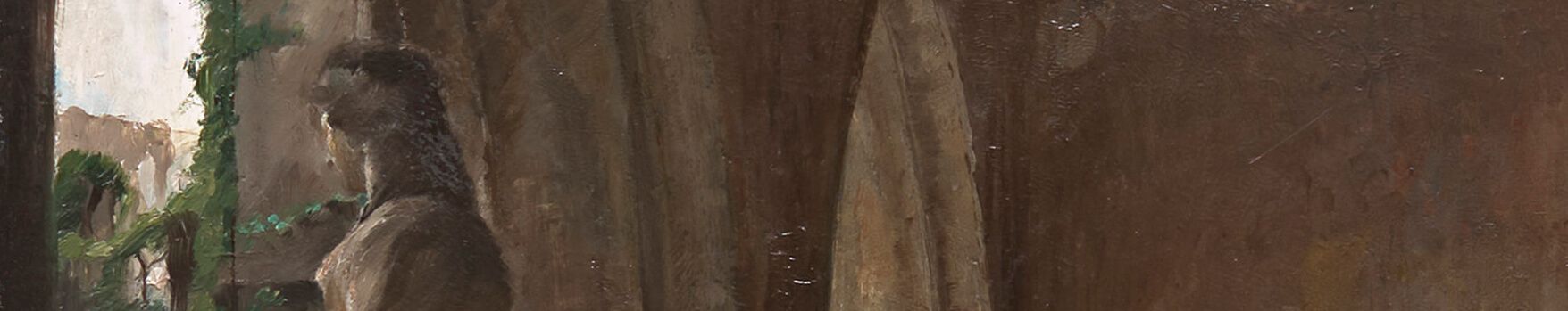 Anniversary exhibition at Bergens kunstforening on the occasion of Harriet Backer's 80th birthday in February and March of 1925. The earliest work was Solitude painted in Munich and Paris between 1878 and 80, and the latest was Interior from Vendelsborg painted in Asker outside of Oslo the previous summer. Some months before the exhibition opened the early painting The Farewell from 1878, which Harriet Backer had assumed was lost was found and was included in the exhibition. This was the first time The Farewell had been exhibited for almost 50 years.