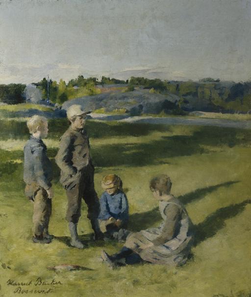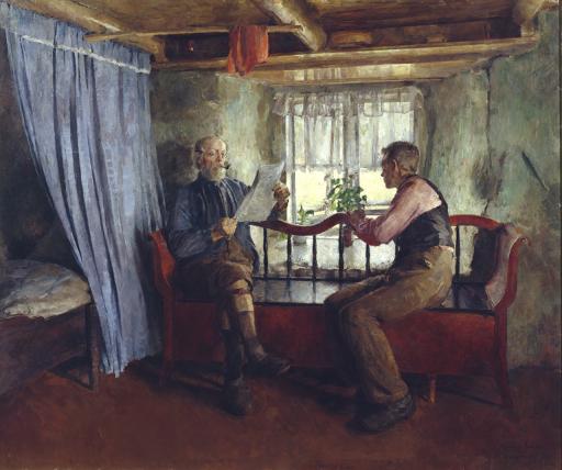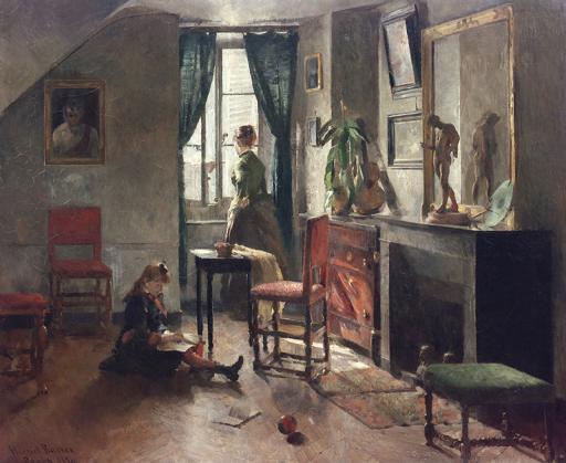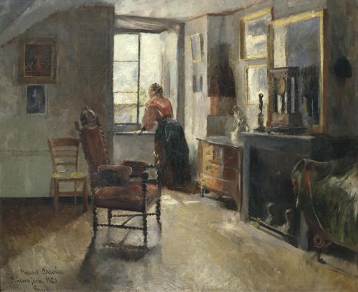 Anniversary exhibition at Christiania Kunstforening on the occasion of Harriet Backer's 80th birthday in January and February of 1925. The earliest work was Solitude painted in Munich and Paris between 1878 and 80, and the latest was Interior from Vendelsborg painted in Asker outside of Oslo the previous summer. Some months before the exhibition opened the early painting The Farewell from 1878, which Harriet Backer had assumed was lost was found and was included in the exhibition. This was the first time The Farewell had been exhibited for almost 50 years.